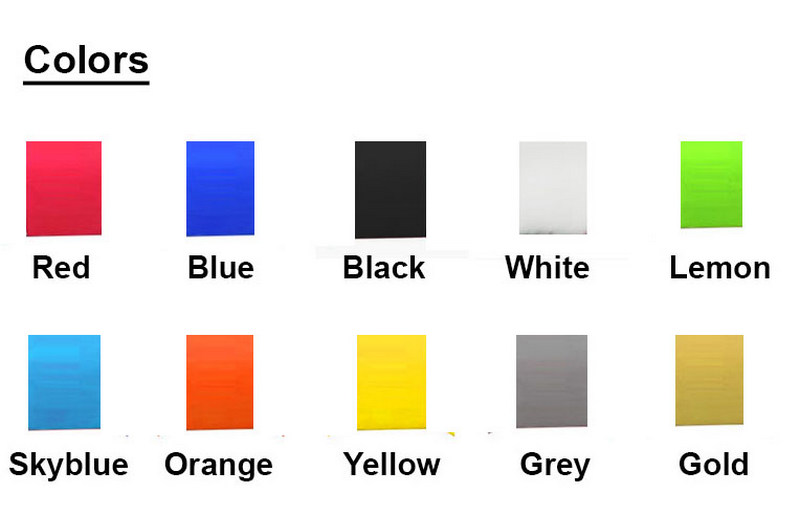 - Farger: Rød, Blå, Svart. Hvit, sitron, himmelblå, oransje, gul, grå, gull